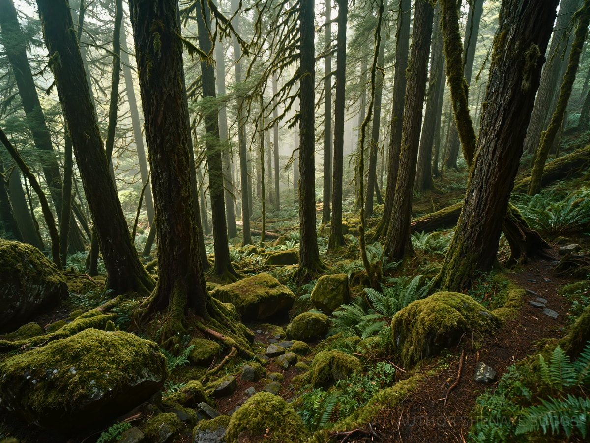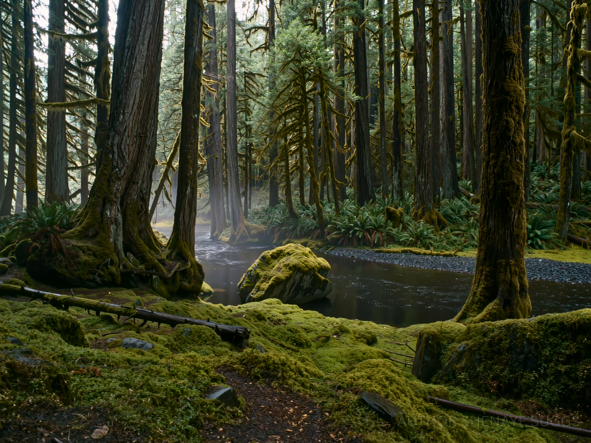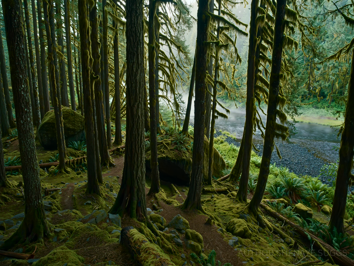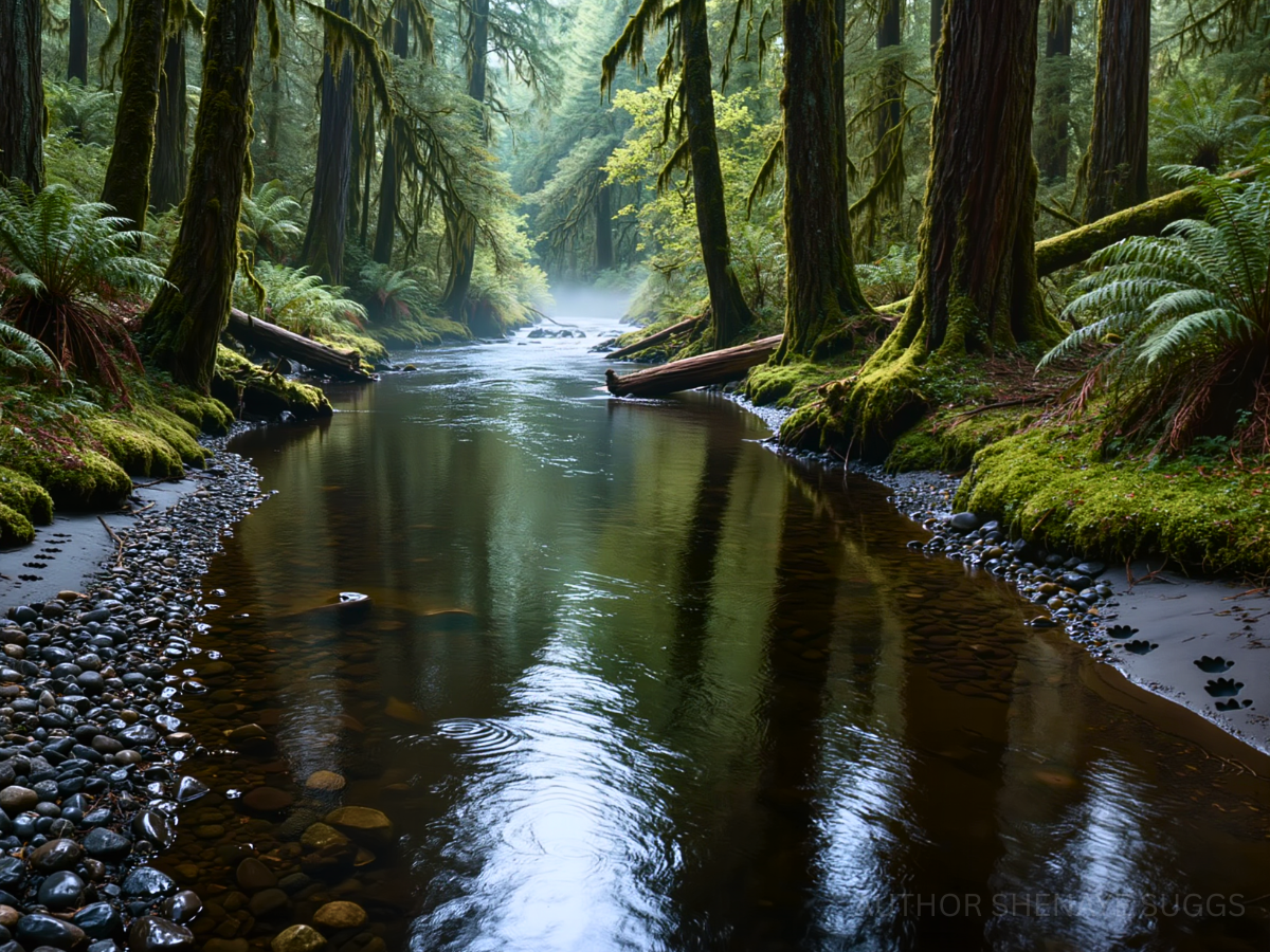 Atmosphere: Towering evergreens and dense understory create a layered green canopy, filtering light into soft, moss-colored glow. The ground stays damp with rich soil, fallen needles, thick moss climbing over rocks, tree trunks, and even old paths that barely hold their shape. Everything feels close. Sound travels differently—muted, absorbed, softened. The air smells of wet bark, earth, and something faintly animal beneath it all. And then there are the prints. Large. Deep. Unmistakable. Pressed into mud, moss, and soft earth—paw prints too big to ignore, appearing without pattern, sometimes fresh, sometimes half-sunken with time. They don’t follow trails. They don’t lead anywhere obvious. They just… appear. No confirmed sightings. No clear answers. Just the quiet understanding that something moves through Dogwood Forest with intention and that it knows the land better than anything else here. And the river? Canis Labrum? The dog’s bowl? Yeah… somethin’ ain’t adding up.