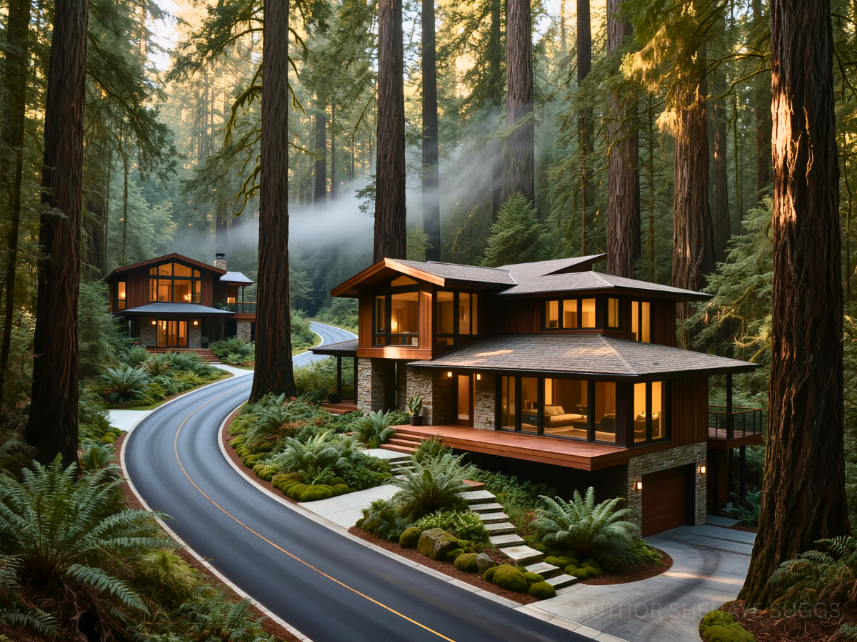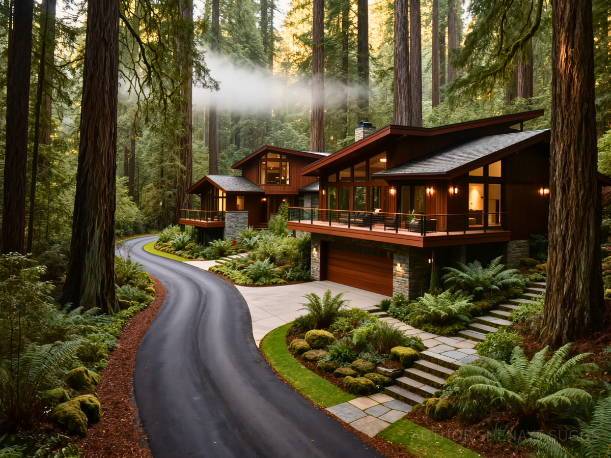 Atmosphere: Towering evergreens filter the light into soft green-gold ribbons. Rain taps gently against smoked glass windows. Moss curls between stepping stones while cedar decks glow amber under lanternlight. The air carries damp earth, wood smoke, and pine resin. It feels alive but hushed. Like the forest itself is whispering blessings.
