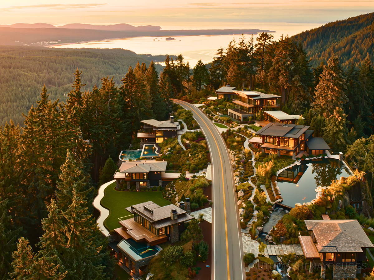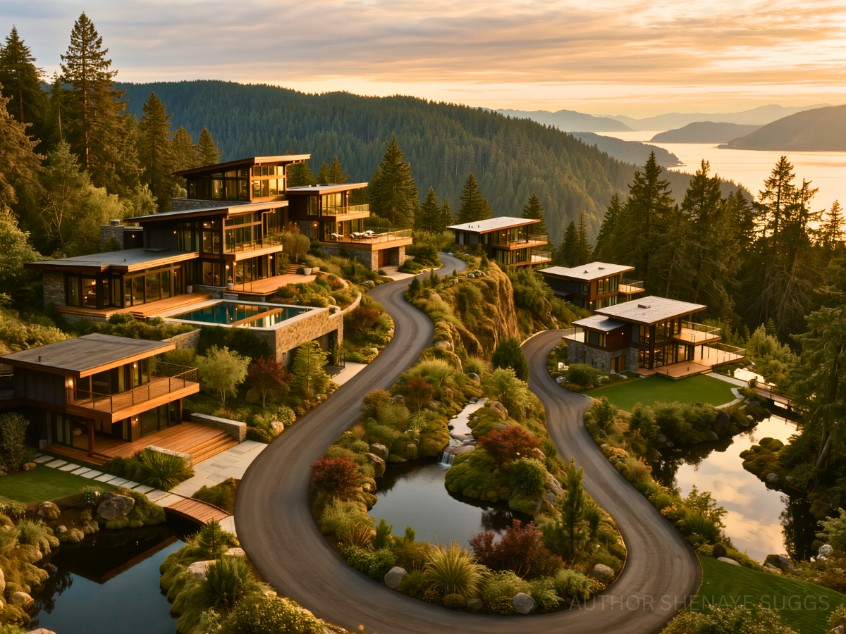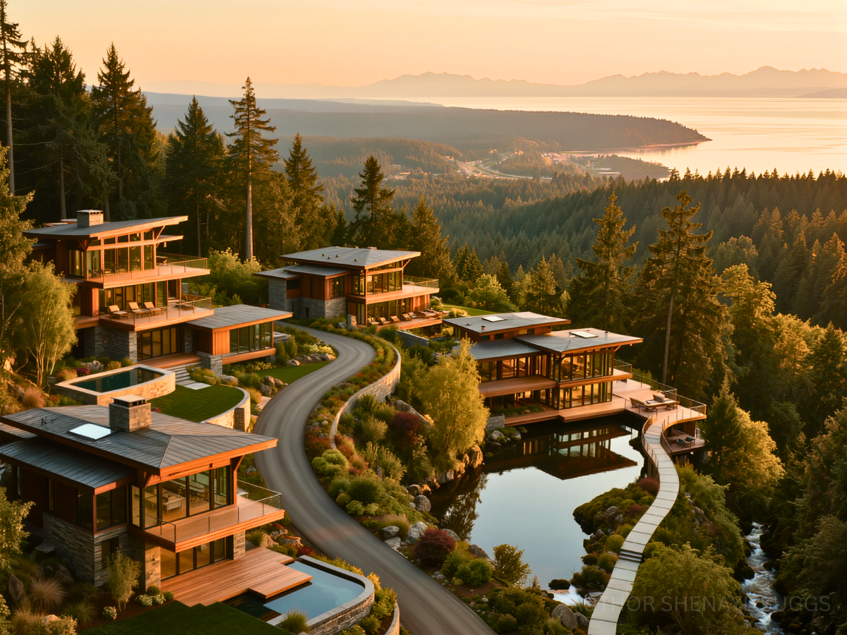 Atmosphere: Sunlight pours softly through pine canopies and reflects across still ponds and glass walls. Wide wooden terraces hover above mossy slopes and small creeks. Wind chimes and distant birdsong drift between homes spaced far apart along the ridgeline. The air carries cedar, jasmine, and faint woodsmoke from evening fire pits. The neighborhood feels serene, watchful, and quietly luminous.