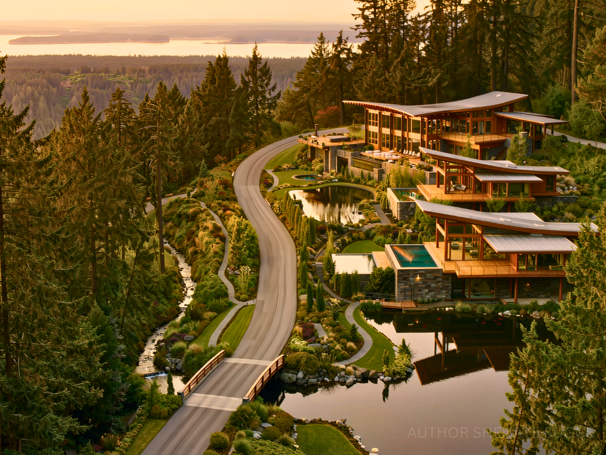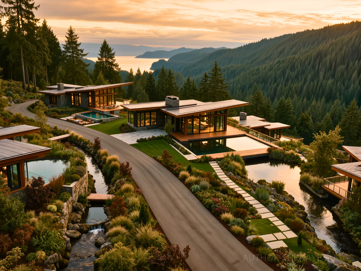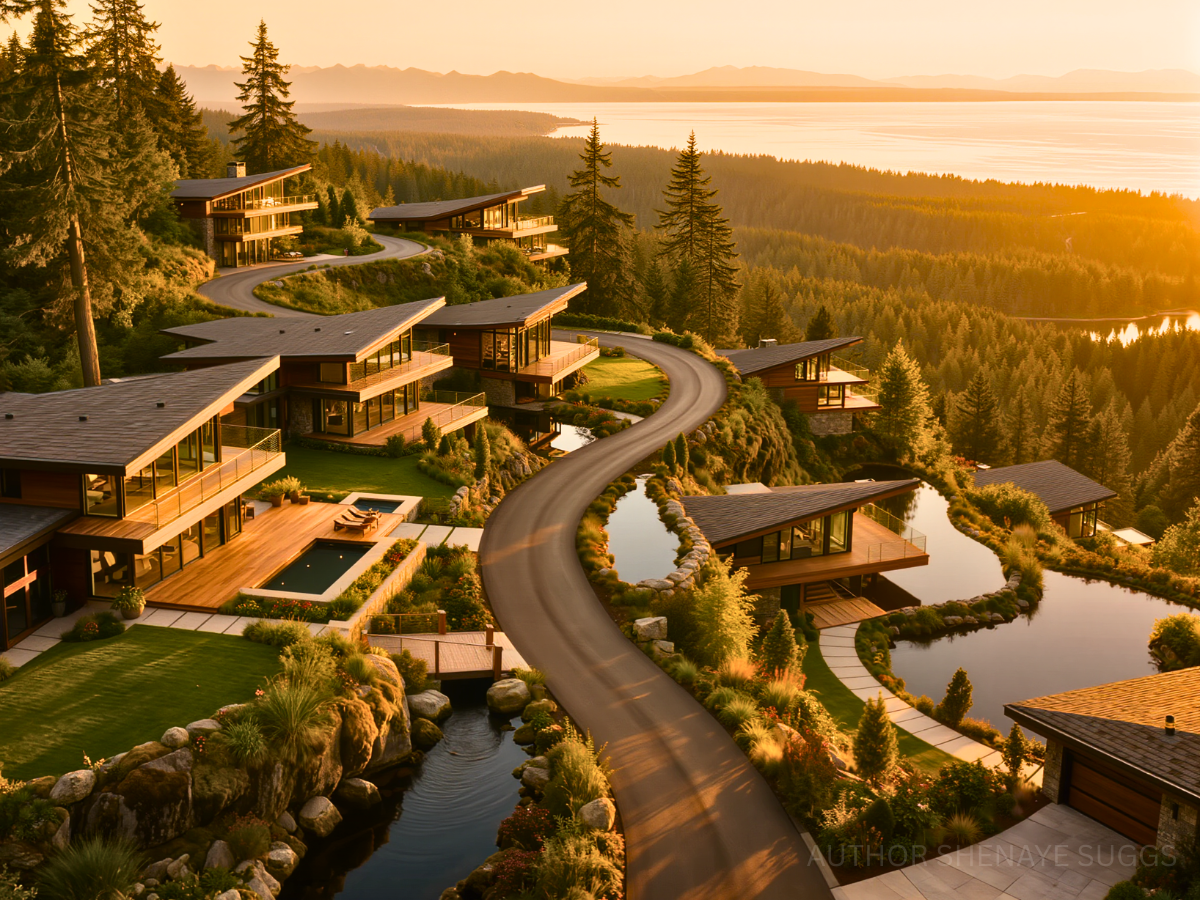 Atmosphere: Sunlight pours softly through pine canopies and reflects across still ponds and glass walls. Wide wooden terraces hover above mossy slopes and small creeks. Wind chimes and distant birdsong drift between homes spaced far apart along the ridgeline. The air carries cedar, jasmine, and faint woodsmoke from evening fire pits. The neighborhood feels serene, watchful, and quietly luminous.